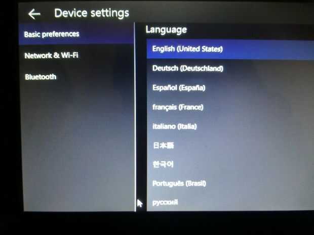 La ficha Configuración de dispositivo le permite seleccionar el idioma y ver la red y Wi-Fi y dispositivos diente azul. No existe soporte para Wi-Fi y dispositivos diente azul.