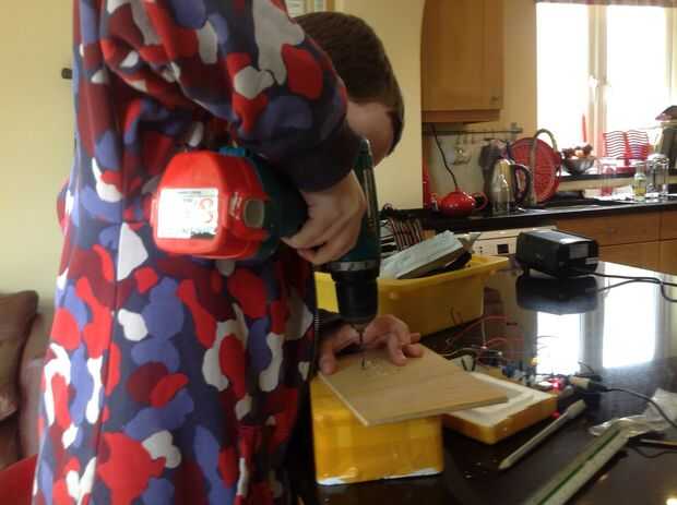 Comenzar por la medición de la longitud del cable más corto que sale el LED. Esto le da la máxima distancia entre los LEDs en el cubo de modo que se puede dibujar una cuadrícula de 3 x 3 en un pedazo de madera contrachapada y taladre 9 orificios del mismo tamaño que los LEDs por ejemplo 3mm o 5mm.