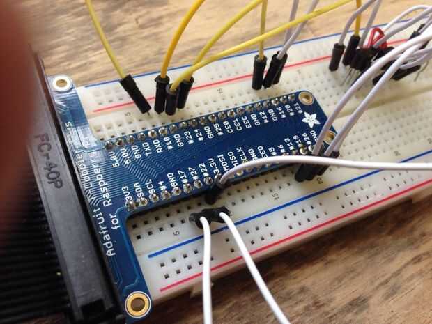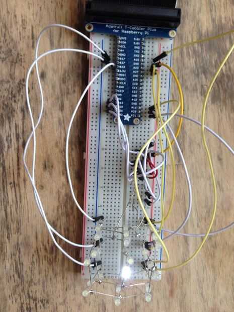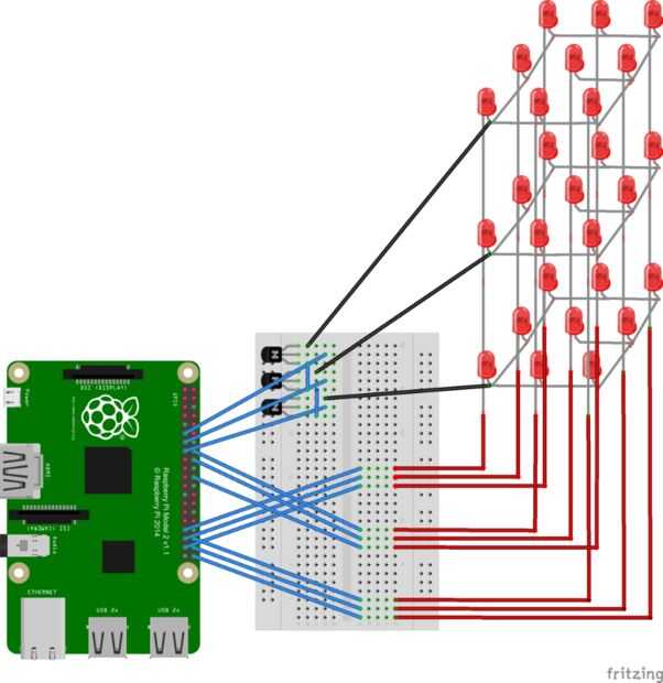 El zapatero de Adafruit está conectado a la placa y es simplemente un caso de conexión de 9 pines de salida GPIO a los 9 LED cubo vertical los cables. Poner el poder a uno o más de estos pines permitirá la columna correspondiente de 3 LEDs para iluminar potencialmente. Para completar el circuito necesitamos unir cada una de las 3 capas a tierra. Si atribuimos directamente a tierra entonces las tres capas siempre se conectarán a tierra y sólo podrá iluminar una columna de LEDs en lugar de individuales.
