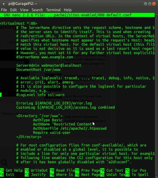 Comenzar por el archivo de host virtual que desea agregar una restricción a la apertura. Para nuestro ejemplo, utilizaremos el fichero default.conf 000 que contiene el host virtual por defecto instalado mediante paquete de apache de Raspbian: