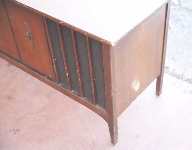 Yo estaba sordo en las profundidades de un garaje almacén oscuro húmedo de una tienda de caridad. Pasaba y le preguntó si él podría ayudarme a encontrar algo. Le dije que estaba buscando una vieja radio. Se refirió a la esquina y le dijo deja ver en esta pila. Nos tiró dos vacío mediados años 70 gabinetes de esta consola bien debajo de la pila de basura. Dijo él enchufado hace un tiempo y no funcionó. (Yo sé mejor que enchufe en un radio de tubo sin comprobar primero.) Nos tiró de él hacia fuera y rompió la pierna. Me sentí mal por él, le preguntó cuánto. Dice $20 y se fue en mi carro.