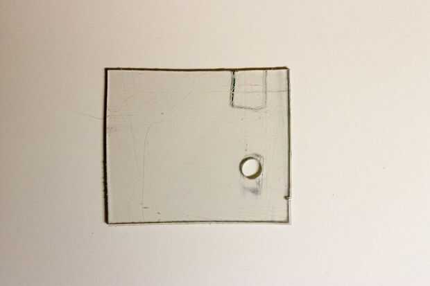 - Coloque el acrílico de 3 7/8 pulgadas x 4 pulgadas por encima de la placa del circuito LCD pantalla. Observe cómo no está nivelado. Utilizando un marcador, dibuje en la hoja de acrílico donde la fuente de alimentación o fuente de vídeo en la parte superior derecha y el condensador que cerca de la mitad inferior derecha.