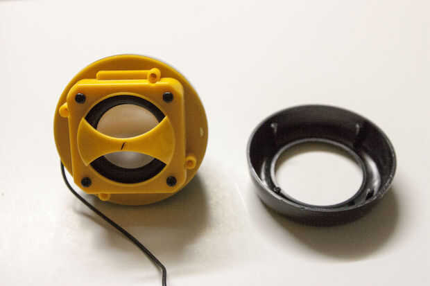 • Con un par de guantes de goma para ayudar a usted, gire y tire la parte delantera de los altavoces hasta que deja pequeño boquete.