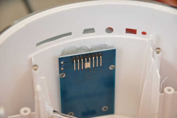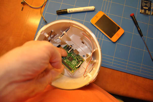 El lector de RFID es pegar con una pistola de pegamento. Tenga en cuenta que la cabecera se suelda en la parte posterior del lector. Esto hace posible poner al lector lo más cercano al exterior como sea posible. Luego, conecte los cables con cinta de Dupont para el lector y los otros extremos a la frambuesa Pi. Últimos pasos están pegando el Raspberry Pi en lugar, conectar los conectores de audio y de alimentación y cerrar el caso!