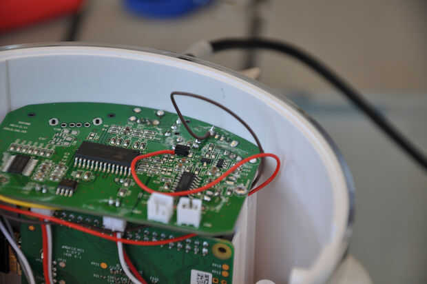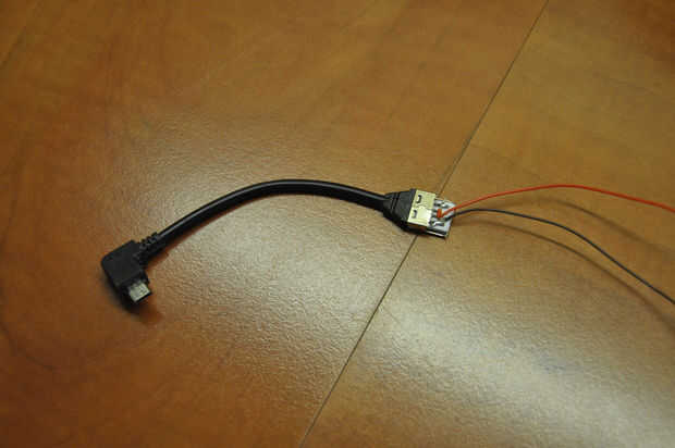 Un micro-USB muy corto al cable del USB proporciona alimentación a la frambuesa Pi. Con un cuchillo afilado, corté abierto el conector USB normal, por lo que he podido conectar los cables a los pines de alimentación. Como el Andrew KNG es alimentado a través de un regular (mini-) conector USB, es muy simple encontrar un + 5V y GND en el PCB de Andrew interna de KNG.