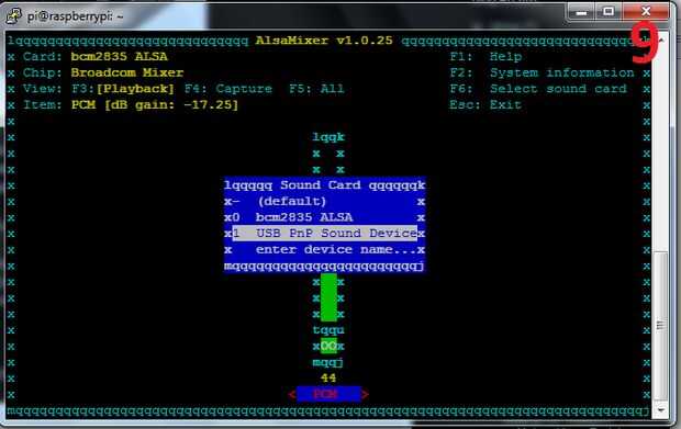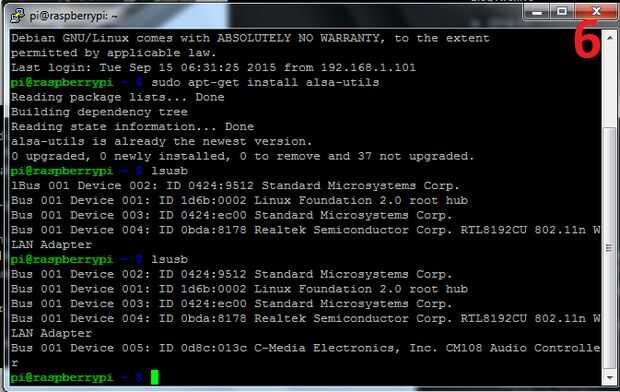 Asegúrese de que el Raspberry Pi está apagado Inserte el dispositivo de audio USB en una de las tomas USB en la Raspberry Pi y luego encender el Raspberry Pi. El dispositivo de audio USB debe instalarse automáticamente. Ir en ventana SSH o LXTerminal, escriba lo siguiente y presione Entrar