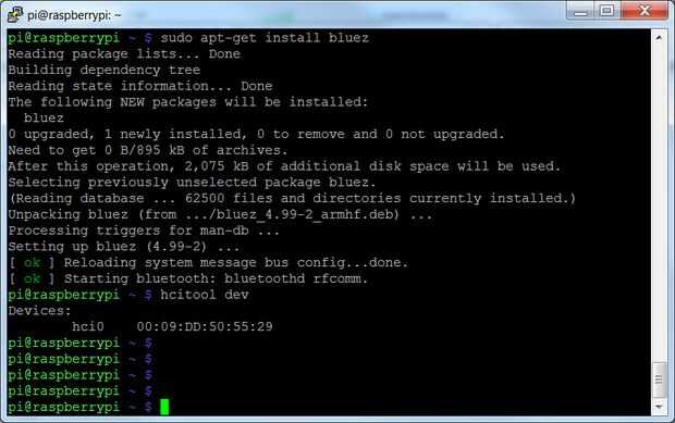 En la terminal se puede utilizar hcitool para revisar el dispositivo, por ejemplo, escriba