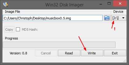 Después de que haya finalizado la descarga de Pi MusicBox (tenga en cuenta: es bastante grande... 230 MB), descomprima el archivo .img incluido. Para escribir este archivo de imagen de disco en tu tarjeta SD, necesita un software que es capaz de hacer esto. Cuando estás sentado frente a un sistema Windows, solo descargar e instalar el libre Win32 Disk Imager. Después de la instalación, ejecutarlo y seleccionar la letra de unidad correcta "aparato" (realmente comprobarlo para evitar borrado de otra unidad por error!) y selecciona el archivo .img descomprimido. Haga clic en "Escribir" escribir el archivo de imagen en la tarjeta SD.