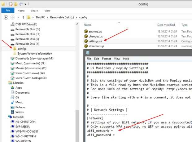 - Introduzca su nombre de red Wifi (SSID) y passwort de Wifi en el settings.ini en el siguiente "wifi_network" y "wifi_password". No olvide guardar el archivo settings.ini luego. Tenga en cuenta que Pi MusicBox sólo soporta WPA Wifi, no WEP!