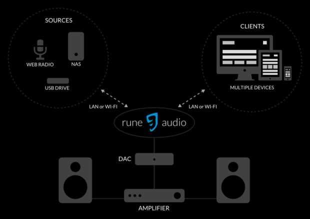 - Acceder a tu música a través de la red. También se puede leer de memorias de USB, pero los mejores resultados ocurren cuando la música está almacenada en un NAS, montado mediante el protocolo NFS .
