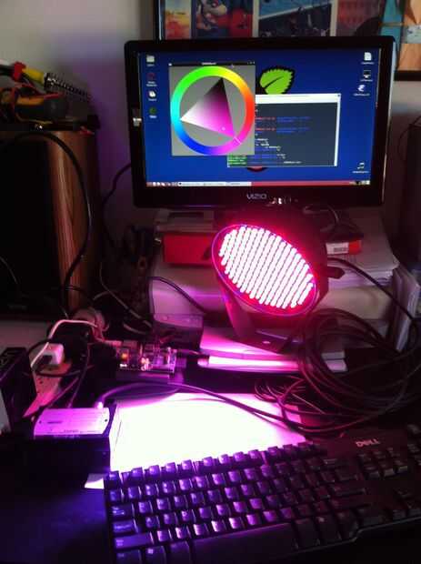 Funciona prácticamente cualquier DMX controlado accesorio ligero que tiene canales rojos, verdes o azules, y de hecho usted puede encadenar varios si quieres t controlan un banco entero de luces de su raspi. En este ejemplo estamos utilizando un proyector Chauvet LEDSplash 200B porque encontramos uno barato en línea por cerca de $60 y su muy brillante y funciona cool. Si tienes un DMX dimmer y estándar PAR latas que ha fina también, sólo es importante usted tiene un dispositivo que puede recibir canales de intensidad de rojo, verde y azul.