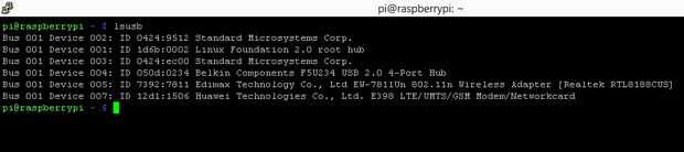 Para obtener más información sobre los dispositivos USB conectados a la Pi, utilizamos el comando "lsusb". Abra una ventana de terminal y escriba: