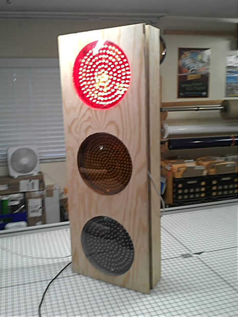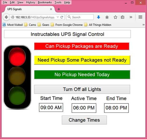 Sobre estoy mostrando mi semáforo de UPS. El servidor web permite a mí o a mis empleados establecer el estado de la luz a través de la red. La luz indica que nuestro hombre UPS cómo nuestros envíos están sin él salir de su carro. A veces podemos salvar le la caminata a nuestra oficina. Es particularmente agradable para él cuando esté lloviendo.