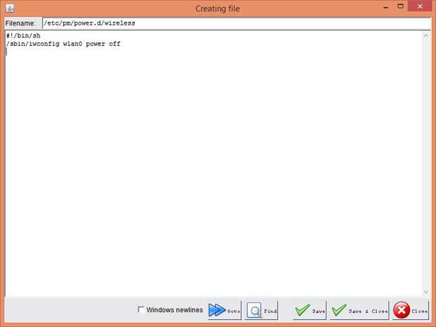 Se debe crear una nueva carpeta en /etc/pm/power.d. Y un nuevo archivo en /etc/pm/power.d/wireless. En el /etc/pm/power.d/wireless pone el siguiente archivo.