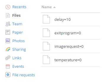 Una vez que la aplicación de Dropbox, es hora de pensar en cómo se utilice la carpeta resultante en su cuenta de Dropbox para interactuar con su Pi. Esto se logra sencillamente. El script en Python que se ejecutará en el Pi utilizará un subconjunto de comandos de la API de Dropbox para buscar y modificar los nombres de algunos archivos vacíos, sin extensión en la carpeta de la aplicación. Llamaremos estos archivos 'archivos' como cada uno le permitirá controlar un aspecto diferente del comportamiento del sistema de monitoreo. La imagen de arriba muestra los cuatro archivos de parámetro que necesitan estar presente en la carpeta de la aplicación de Dropbox para este proyecto. Crean es simple:
