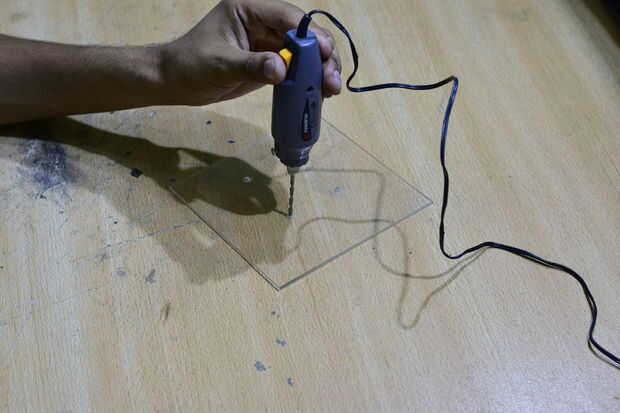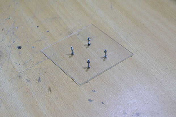 Para construir el corte base el plexiglás si es necesario el score y ajustar técnica. Marque el centro de plexiglás y el Pi en el centro. Marque los cuatro orificios en la base utilizando un rotulador. Perforar con una broca de tamaño correcto según sus tornillos. Puede que necesite ejecutar el taladro a través de los agujeros en el Pi así. No utilice tornillos de diámetro más grandes ya que puede dañar el Pi. Coloque los tornillos en los agujeros y apretar hacia abajo. Luego añada más las tuercas un poco más altas. Coloque el Pi y añadir las nueces por encima de él para todo.