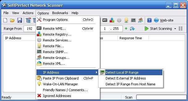- Haga clic en Opciones > dirección IP > detectar el rango de IP Local de menú como se muestra en la figura