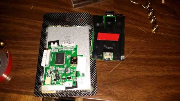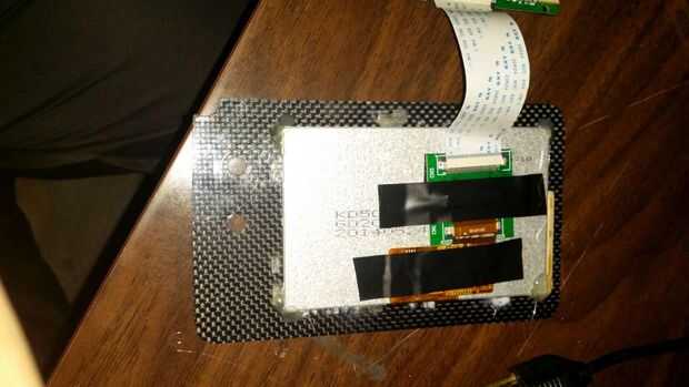 La pantalla se mantiene en su lugar con una gota de pegamento caliente a lo largo de los bordes de la placa de fibra de carbono. Luego até el tablero de conductor a la pantalla con cinta de doble palo.
