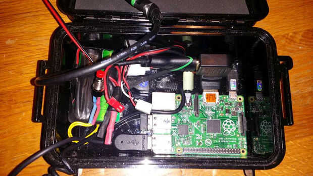 El Raspberry Pi es prueba en lugar de enrutamiento de los cables y asegurando que todo cabrá debajo de la placa. El amplificador se encuentra que un destornillador de bolsillo caben en el paso del cable por girar la perilla de resistencia.