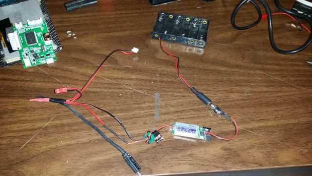 La cosa fresca sobre el circuito de eliminación de la batería es que puede la salida 3A nominales con ráfagas de 6A en la C.C. de 5Volts y acepta un voltaje de entrada de 23VDC 5.5 para que sistemas eléctricos auto ruidoso no deben ser un problema. Ya podemos alimentación mediante pilas alcalinas secas en un soporte de la batería o mi banco de alimentación superior. A través del proceso probé continuidad de polaridad correcta después de cada conexión y antes de enchufar todo en el botón de Pi