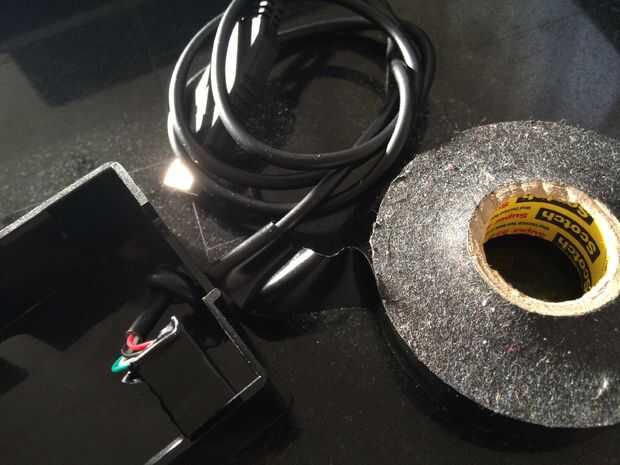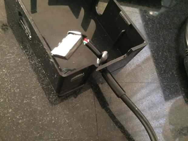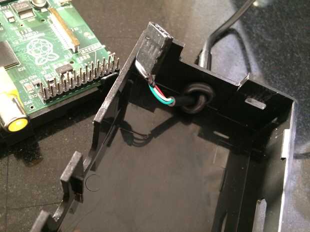 Taladré un agujero en la parte posterior de la caja; porque pensé que parecía agradable y era cerca de los pines GPIO... ató la cinta aislante interior y uso en el exterior para que se vea bonito... y deja el cable en o siendo rasgado hacia fuera.