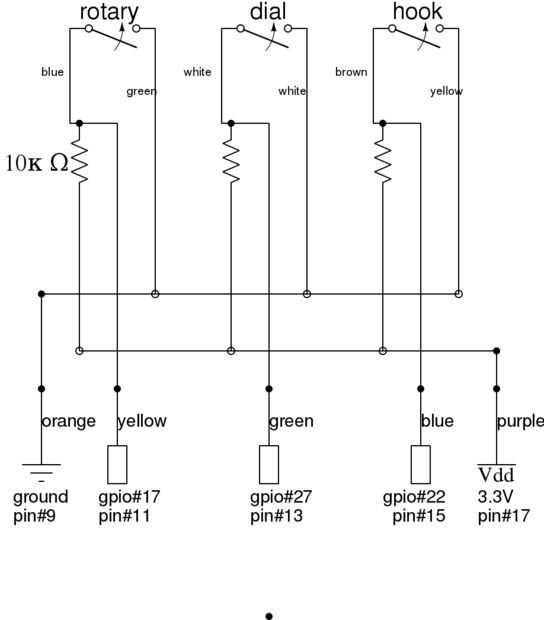 Para que sea fácil de conectar y desconectar el cableado, hice mi propio "cable de arco iris" por pegar los terminadores de puente. Elegí una fila de pines GPIO que estaban todos en una línea. Específicamente que conectado a los pines 9,11,13,15 y 17 que incluyen una tierra (pin 9) y una de 3.3V (pin 17) y entre ellos tres pines GPIO. Alambré el rotary al pin 11, el dial a pin 13 y el gancho al pin 15, como se muestra en el diagrama.