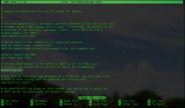A continuación editaremos/etc/dhcp/dhcpd.conf, un archivo que instala nuestro servidor DHCP - esto permite conexiones wifi obtener automáticamente direcciones IP, DNS, etc..