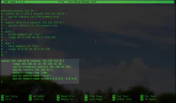 subnet 192.168.42.0 netmask 255.255.255.0 { range 192.168.42.10 192.168.42.50; option broadcast-address 192.168.42.255; option routers 192.168.42.1; default-lease-time 600; max-lease-time 7200; option domain-name "local"; option domain-name-servers 8.8.8.8, 8.8.4.4; } Desplácese hacia abajo y añadir las siguientes líneas