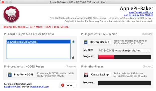 Hay un montón de tutoriales en línea sobre cómo instalar Raspbian en la Pi. Voy a mostrarte el camino lo hice con ApplePi Baker en OS X. No tienes que hacer exactamente como esta pero me pareció ser mucho más rápido que permitir que el sistema operativo a instalar el Belén de la Pi.