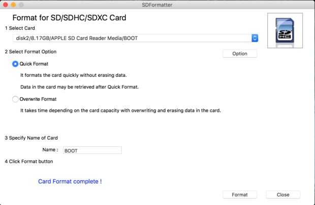 Comience descargando Raspbian y guardarlo en tu escritorio luego proceder a formatear la tarjeta SD a FAT32 usando cualquier método. He utilizado SDformatter.