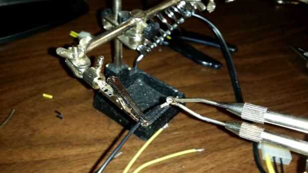 Recortado de 2 x 2 final dio lugar a 4 hilos que necesita ser dado vuelta en los pernos. Traté de jamming el alambre torcido en las tomas pero mantuvo electro hacia fuera. Terminé usando mi pistola de soldar para estañar los extremos con soldadura para evitar que se deshilache.