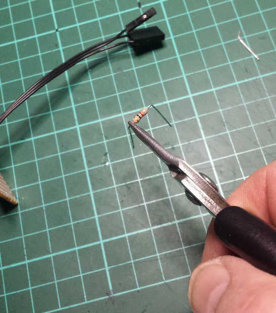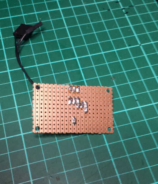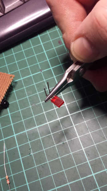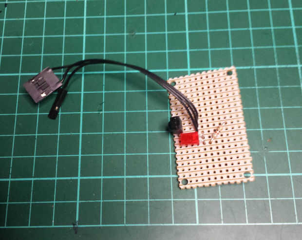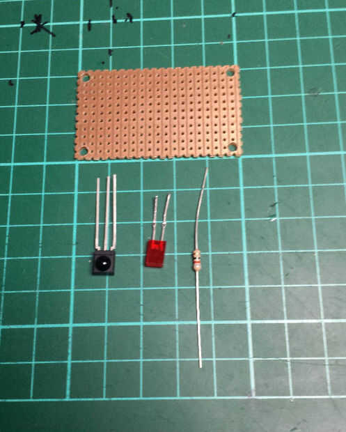 El caso ha sido diseñado para caber estándar 0,1" espaciamiento veroboard. Cortar un trozo de veroboard 2 "x 1,2", luego Taladre cuatro agujeros en las esquinas muy. Montar el TSOP32238, el LED y el resistor, como se muestra. Si coloca el cátodo del LED cerca de la TSOP32238, sólo puede doblar el plomo sobre conectar a tierra.