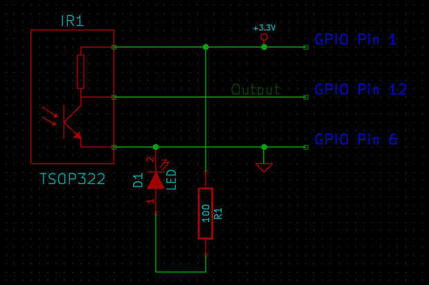 Si lo prefiere, puede usar los pines 12 y 14 que están en lo correcto al lado de uno a (pin 14 es tierra también). También se podría utilizar un pin GPIO diferentes, es usted, pero usted tendrá que recordar que pin utiliza para IR de entrada.