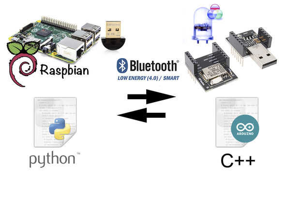 Estará haciendo uso de un Raspberry Pi, una computadora con una placa la Raspbian distribución del sistema operativo Linux. Porque el Pi no tiene una interfaz nativa de BLE, a conectar un adaptador USB Bluetooth LE a él. Un guión que nos a escribir usando el lenguaje de programación Python nos enviará comandos aplicables a través del adaptador USB. Los comandos enviados por BLE serán recibidos por un microcontrolador independiente a través de su propia interfaz BLE (RFduino).