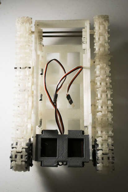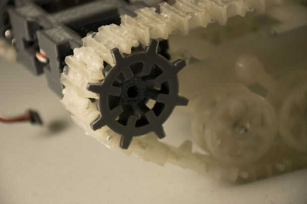 Diseñé este pistas de caterpillar y ruedas motrices en solidworks. No sé que mucho de mecánica así no puede hacer el cálculo de engranajes. Así que yo simulé piezas en solidworks para ver si funciona antes de golpee el botón de impresión. Cada pista está conectado con algunos filamentos de repuesto 3mm. Funciona bastante bien con algunos lijado. Pero el diseño de la pista tiene un defecto, es demasiado suave que es difícil agarrar la superficie tocando suelo. Si imprimo boca abajo, podía añadir alguna pisada, pero el coste material de mucho apoyo por el diente. Soluciones futuras: 1: imprimir el diente por separado y luego pegarlos juntos. 2. aplicar algunos pintura de aerosol de recubrimiento de goma.