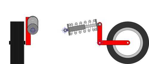 Pensé que cuando el tanque funciona sobre algunos obstáculos, marcha lenta de ruedas puede subir y la pista pierde tensión. Así que añadí algún mecanismo tensor en la rueda trasera. Básicamente sus dos muelles empujando el eje real todo el tiempo, ejerciendo algunos fuerza se a apretado las pistas.
