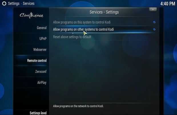 Conectado a una pantalla, podemos obtener la salida de vídeo de gato del HDMI de la Pi para mostrar Kodi con solo un clic. Allí, tenemos que ir a sistema -> Preferencias -> servicios donde tenemos que marcar "Permitir que los programas en otros sistemas de control Kodi" y "Permitir el control de Kodi via HTTP". También podemos activar la funcionalidad AirPlay para nuestros productos de Apple.