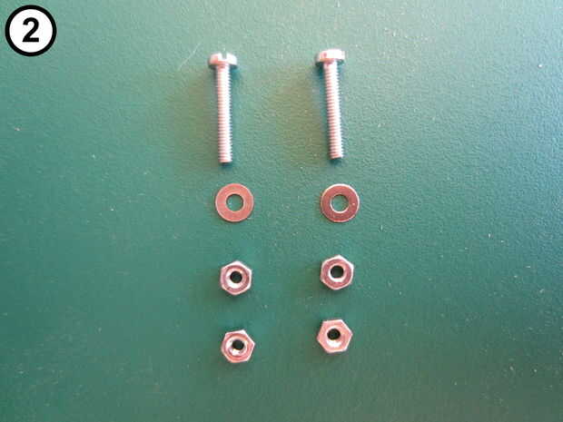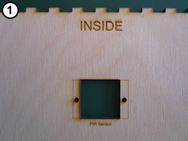 Utilizando los dos tornillos de máquina M2, dos arandelas de M2 y cuatro tuercas M2 (Foto 2) Monte el sensor de PIR (Foto 3) a la parte frontal (Foto 1) como sigue: