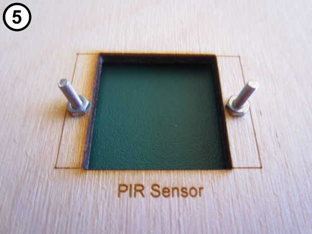 - Deslice el sensor de PIR en los tornillos y asegure en su lugar usando dos tuercas (foto 6). Asegúrese de que los pines del conector están mirando hacia abajo sobre el grabado de "PIR Sensor".