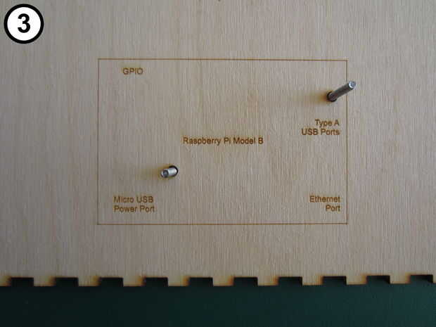 Con dos 3/4 #4-40 tornillos, tuercas y separadores de nylon (Foto 1), Monte el Raspberry Pi en el panel frontal como sigue: