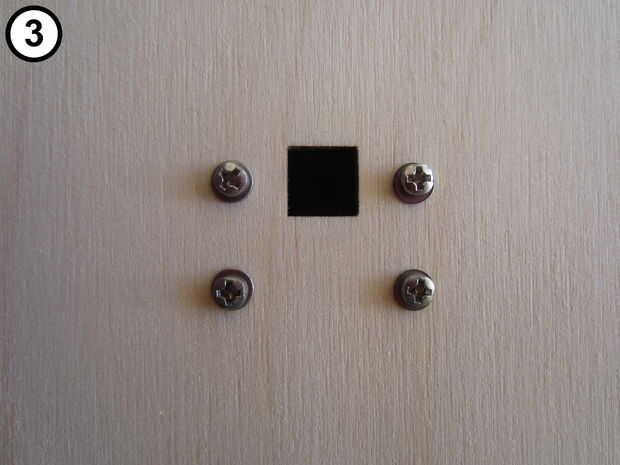 - Coloque una arandela sobre cada uno de los orificios en la parte exterior del panel (no grabado lado) e inserte los cuatro tornillos (Foto 3).