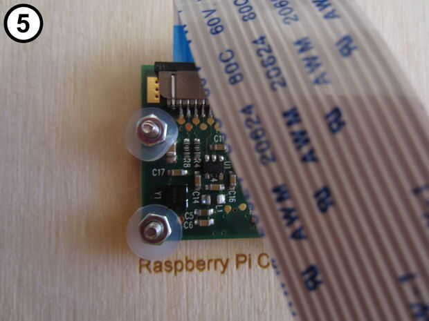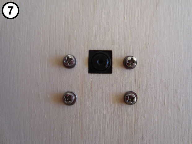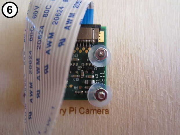 - Coloque la cámara sobre los tornillos, coloque a un espaciador de nylon sobre el tornillo y con cuidado, enrosque la tuerca en su lugar (fotos 5 y 6). No apriete demasiado las tuercas. La cámara instalada se muestra en las fotos 7.