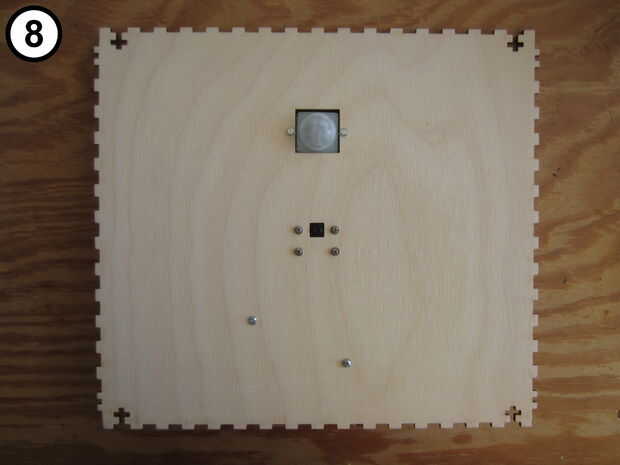 El panel delantero completo con sensor PIR, cámara y frambuesa Pi se muestra en las fotos 8 y 9.