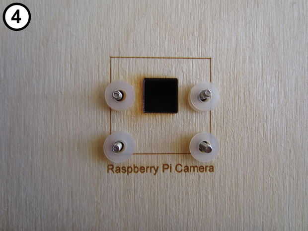 Usando cuatro tornillos de 10mm M2, cuatro arandelas M2, doce #4 arandelas de nylon, y cuatro tuercas M2 (Foto 2) montaje de la cámara de frambuesa Pi (Foto 1) como sigue: