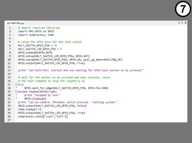 - La línea 26 utiliza la función "subprocess.call" para ejecutar el comando "sudo halt" que hará que el Pi de frambuesa para apagar.