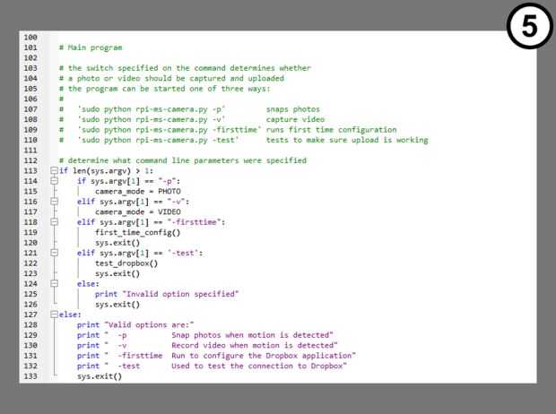 Líneas 87-91 (listado 4) definir la función de "first_time_config". Esta función se llama durante el proceso de configurar el Raspberry Pi cuando se emite el comando "python rpi-ms-camera.py - firsttime". Este comando se utiliza en el paso 9 de este instructivo.