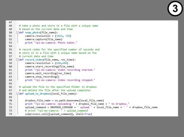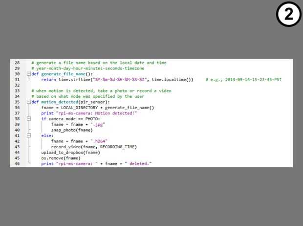 Líneas 33-46 (Listado 2) definir la función de "motion_detected". Esta función es llamada cuando el sensor PIR detecta movimiento. Esta función se ajusta una foto o video, registros sube la foto o el vídeo a Dropbox y elimina el archivo de la Raspberry Pi.