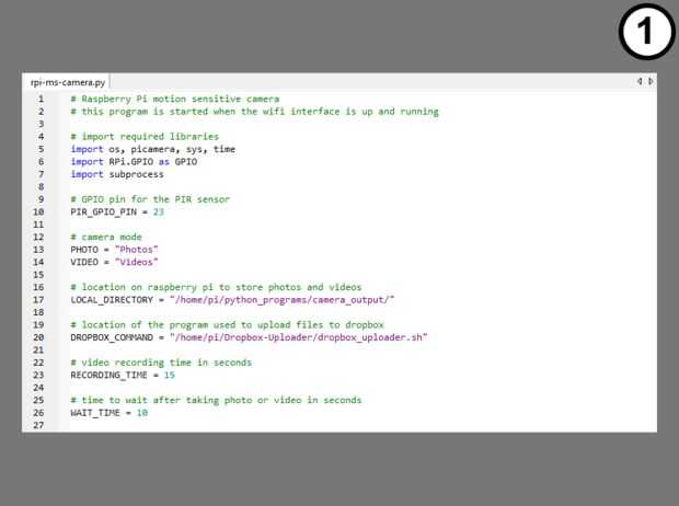 - Línea 23 establece el número de segundos de video en el que se registrarán cuando se detecta movimiento. Esto puede modificarse para adaptarse a sus necesidades. Los segundos más de vídeo grabado, más tiempo tomará para subir a Dropbox.
