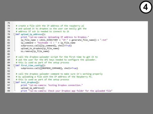 Líneas 76-85 (listado 4) definir la función de "upload_ip_address". Esta función se utiliza para crear un archivo con la dirección IP de la Raspberry Pi y subirla a Dropbox. El propósito de subir un archivo con la dirección IP es hacer más fácil obtener la dirección IP de la Raspberry Pi para propósitos de depuración. Con la dirección IP, es posible utilizar "ssh" para abrir una sesión de terminal a la frambuesa Pi y emitir comandos de Linux.