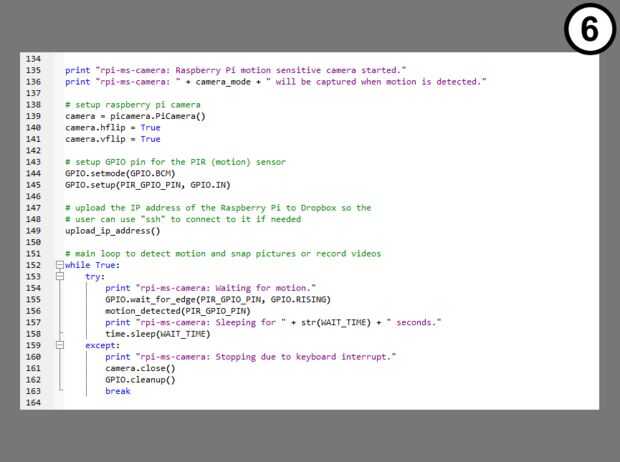 - Las líneas 143-145 establece el pin GPIO para el sensor de movimiento PIR. Hay dos esquemas de numeración de los pines GPIO: línea 144 indica al software GPIO qué esquema utiliza este programa. Línea 145 establece el pin para el sensor de PIR un pin de entrada.